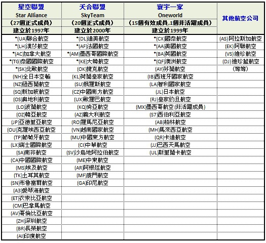 以下是目前各航空公司所屬的聯盟整理